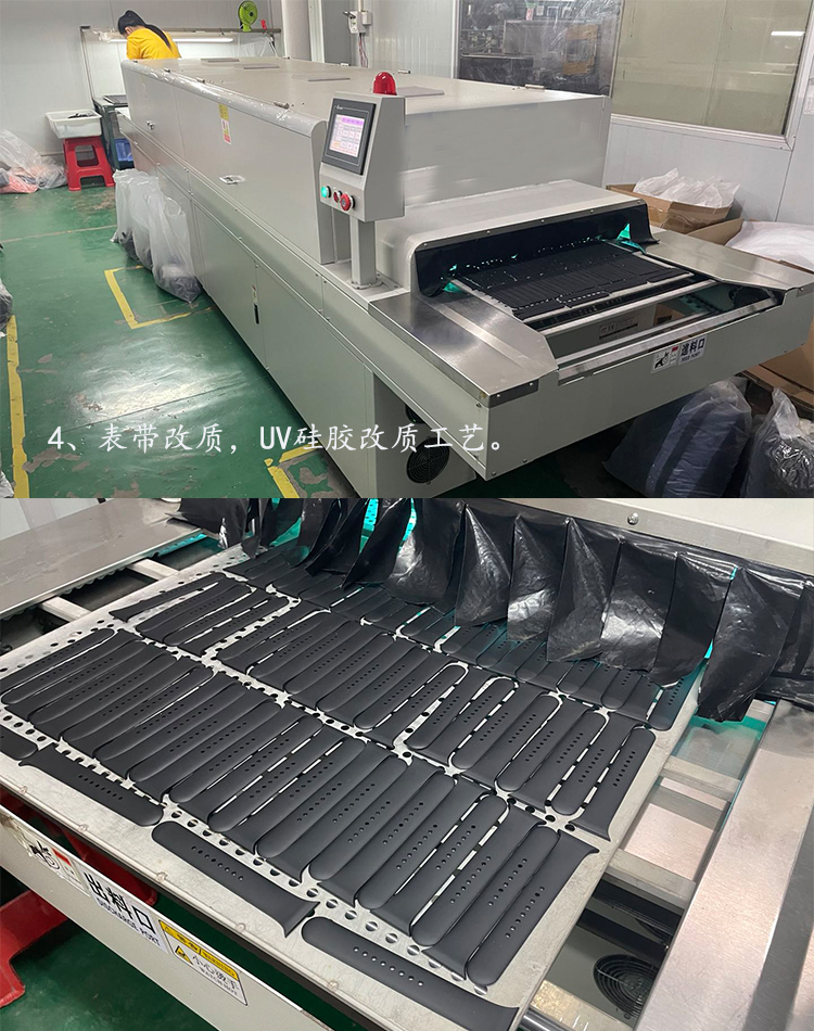 VUV紫外線硅膠表面改質(zhì)概述:主要通過(guò)深紫外線對(duì)硅膠制品進(jìn)行照射,使硅膠內(nèi)部硅膠油析出,單體硅原子在硅膠表面與游離光子、活性氧原子結(jié)合重新排布,使硅膠表層分子結(jié)構(gòu)更加精密,從而在硅膠表面形成保護(hù)層,祛除硅膠表層的黏性、靜電,做到不粘灰塵,手感絲滑的效果。比常規(guī)噴硅膠油,產(chǎn)品優(yōu)勢(shì)明顯,效果時(shí)久,終身有效。是目前硅膠手機(jī)殼、手環(huán)、防滑墊、燈帶、寵物用具、情趣用品等硅膠制品新型表面改質(zhì)環(huán)保工藝。